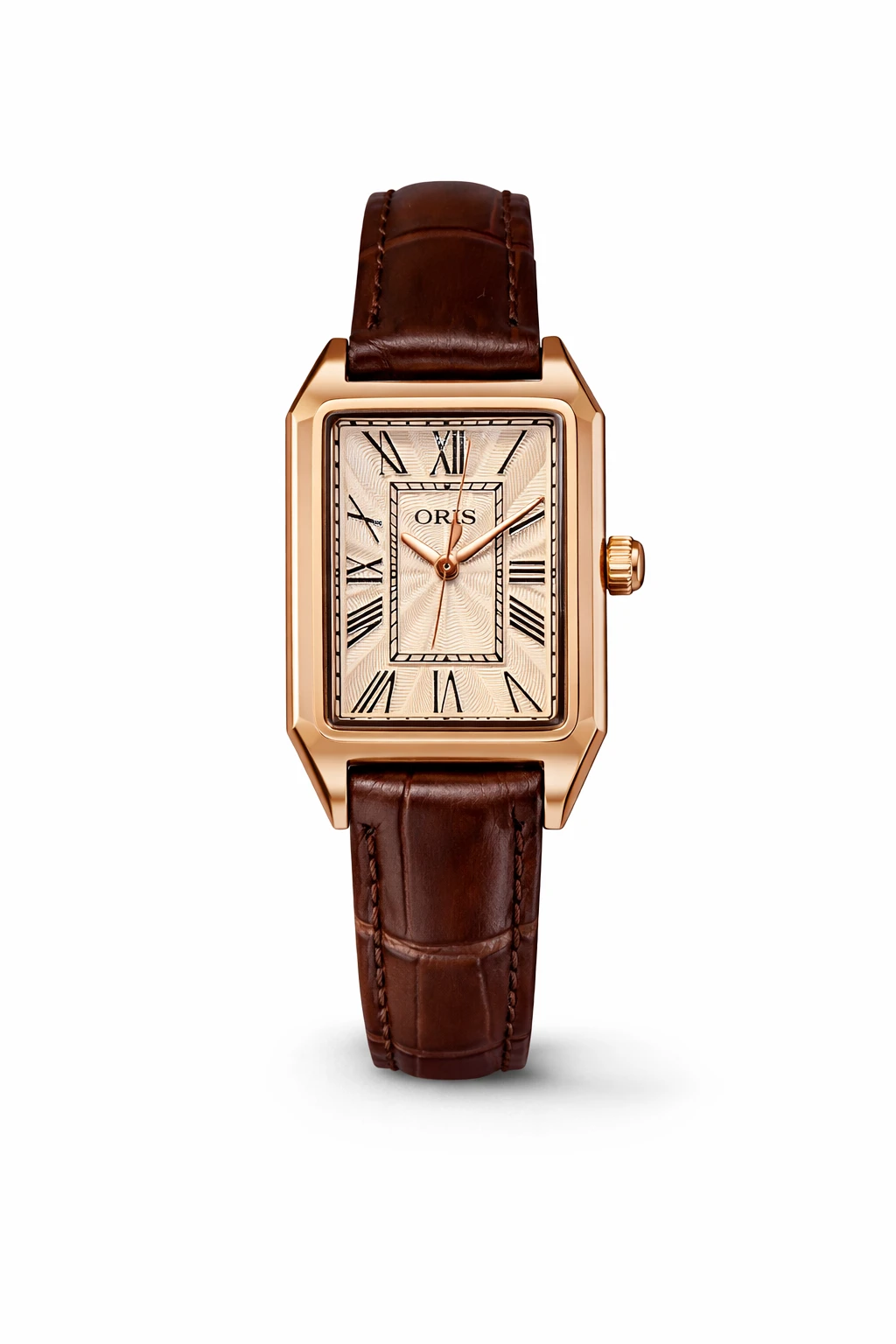 שעון יד קלאסי, גוף מתכת בפוי זהב ורוד, רצועת עור חומה, לוח מלבני, ספרות רומיות, מחוגים אלגנטיים, סגנון יוקרתי, עיצוב על־זמני, שעון אלגנטי ליום ולערב.