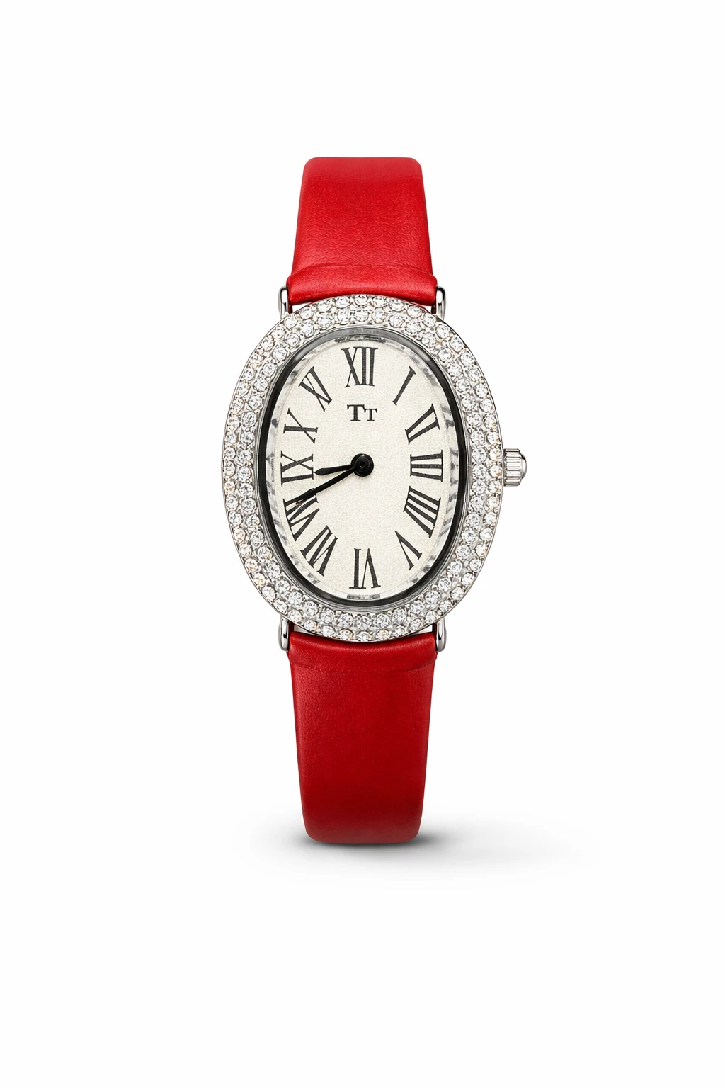 שעון נשי אלגנטי עם מסגרת זרקונים ורצועת עור אדומה, למראה בולט ויוקרתי.