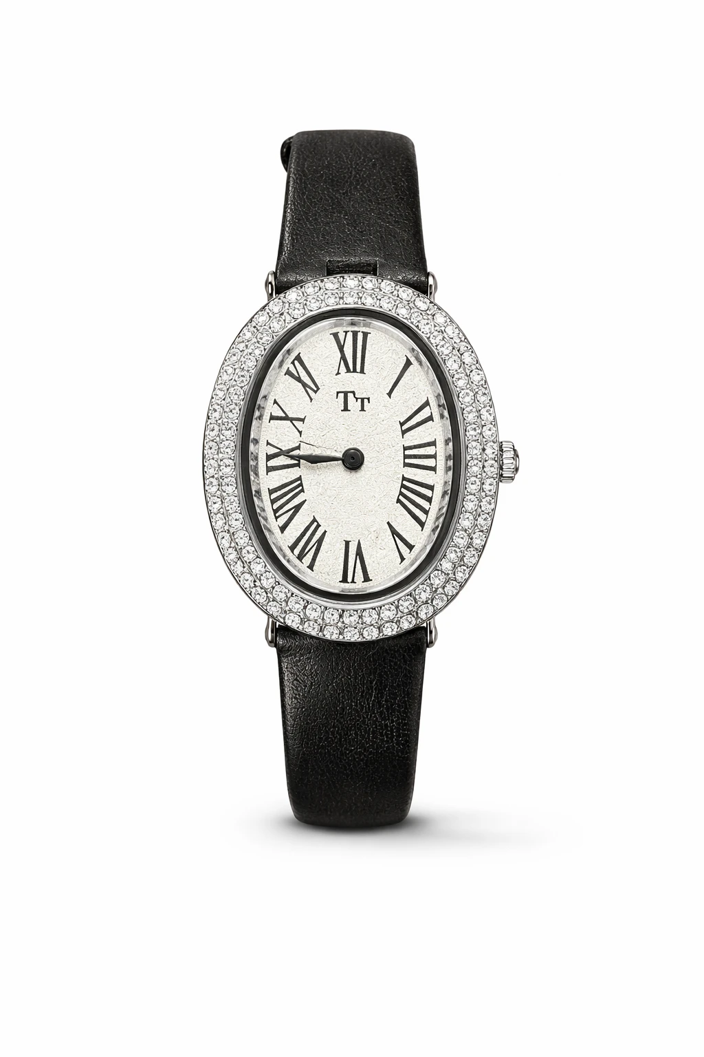שעון אריאנה מעוצב בקו אלגנטי ורך עם נוכחות יוקרתית ועדינה. גוף השעון עשוי מתכת בגימור כסף, בשילוב מסגרת אובלית משובצת אבני זרקון נוצצות שמוסיפות ברק ותחושת תכשיט. לוח השעון בהיר עם טקסטורה עדינה, ספרות רומיות שחורות ומחוגים כהים ליצירת מראה קלאסי וקריא. רצועת עור שחורה איכותית משלימה את העיצוב ומעניקה נוחות מרבית על היד. השעון פועל באמצעות מנגנון קוורץ מדויק, מתאים לשימוש יומיומי, לאירועים מיוחדים ולמי שמחפשת שעון נשי, אלגנטי ועל־זמני עם טאץ’ יוקרתי.