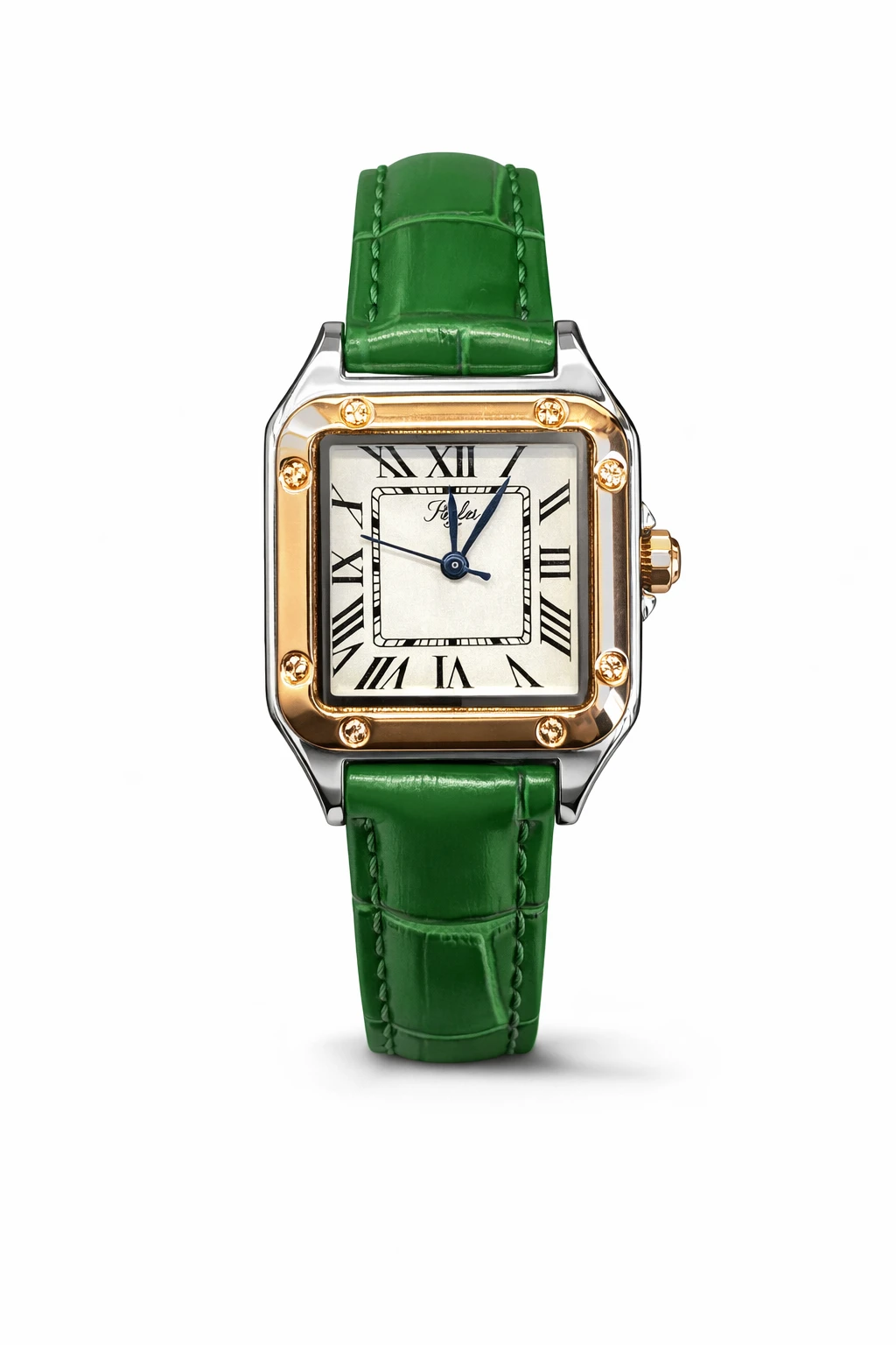 שעון ונציה מעוצב עיצוב קלאסי־יוקרתי עם טאץ’ מודרני. גוף השעון עשוי מתכת בגימור כסף וזהב, מסגרת מרובעת מעוטרת בברגים דקורטיביים המדגישים מראה ייחודי ואלגנטי. לוח שעון בהיר עם ספרות רומיות שחורות ומחוגים כחולים מעניקים ניגודיות גבוהה וקריאה נוחה. רצועת עור ירוקה איכותית עם טקסטורת עור מעניקה לשעון אופי ייחודי ונוחות מרבית על היד. השעון כולל מנגנון קוורץ ומתאים לשימוש יומיומי, לאירועים ולמי שמחפש שעון עם נוכחות, צבע וסטייל יוצא דופן.