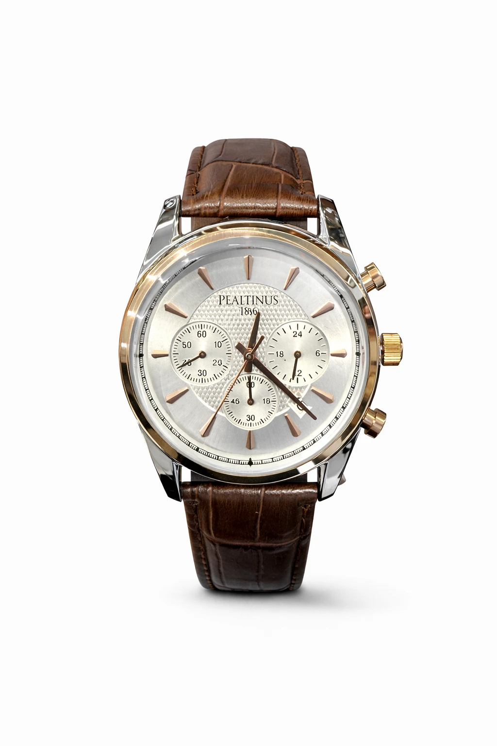 שעון לוקאס מתאפיין בגוף עגול מתכתי בגימור כסוף עם נגיעות זהב חמים, בשילוב רצועת עור חומה במראה קרוקודיל יוקרתי. לוח השעון בגוון כסוף עם טקסטורה מעודנת, כולל שלושה תתי־ות פונקציונלי לוח סגנון כרונוגרף, אינדקסים מחודדים ומחוגים בגימור רוז־גולד. השעון פועל באמצעות מנגנון קוורץ מדויק, ומציע שילוב מושלם בין עיצוב קלאסי, עומק וסטייל יוקרתי. בחירה אידיאלית למי שמחפש שעון גברים עם נוכחות, עור איכותי ומראה מתאים ומתאים גם ליום יום וגם לאירועים מיוחדים.